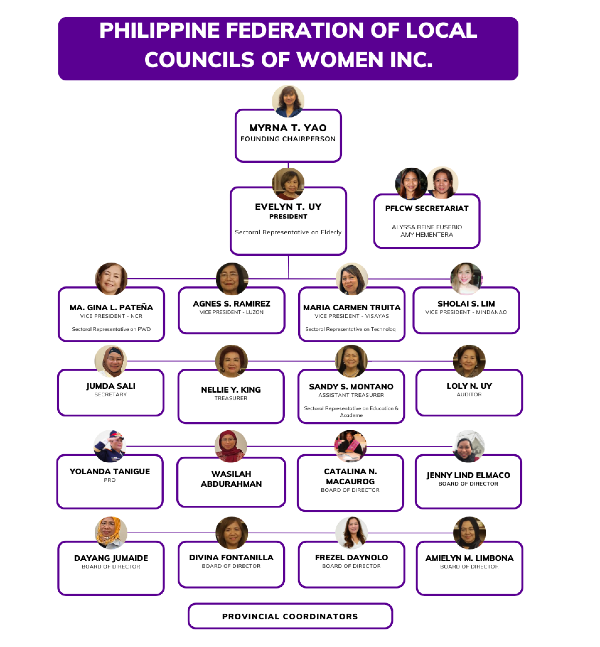 The Philippine Federation of Local Councils of Women (PFLCW), Inc. is the national coordinating body of all the local councils of women in mainstreaming gender and development (GAD) in pursuit of women empowerment, gender equality, social justice, lasting peace, fulfillment and protection of human rights and sustainable development.